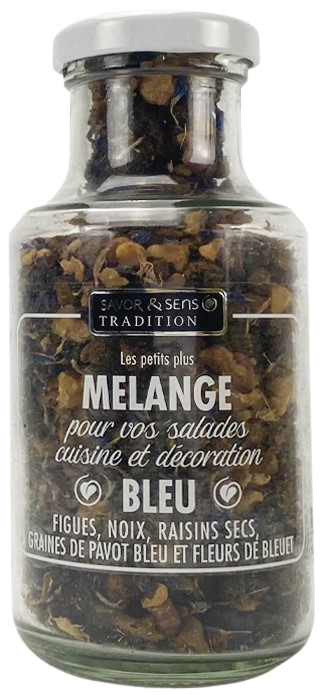 Un mélange de figue, noix, raisins secs, graines de pavot bleu et de fleurs de bleuets à parsemer sur vos salades fromagères ou du sud ouest.
