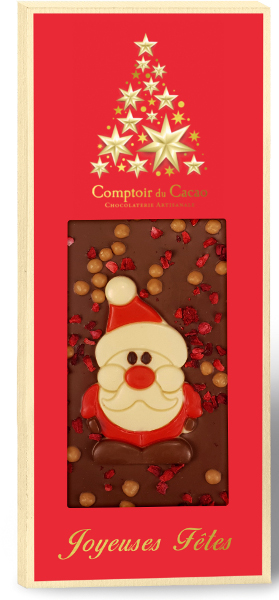 Chocolats lait pur beurre de cacao (minimum de cacao 36%). Sucre, pâte de cacao, poudre de lait entier, beurre de cacao, lait maigre en poudre, amande, miel, sirop de glucose, groseille séchée, lecithine de soja, arôme naturel de vanille, sel, concentré (carotte), colorants alimentaires pour décors de Noël (curcumine, carmin). Peut contenir des traces de: oeufs, gluten, noix, sésame.