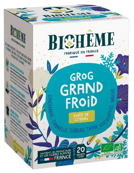 Rien de telle qu’une infusion pour se réchauffer l’hiver ! Le thym et l’eucalyptus libèrent leur puissance aromatique. Les épices de cannelle et le gingembre sont reconnues pour stimuler les défenses naturelles de l’organisme. Le citron et la mauve s’associent à merveille à cette recette douce et réconfortante.
