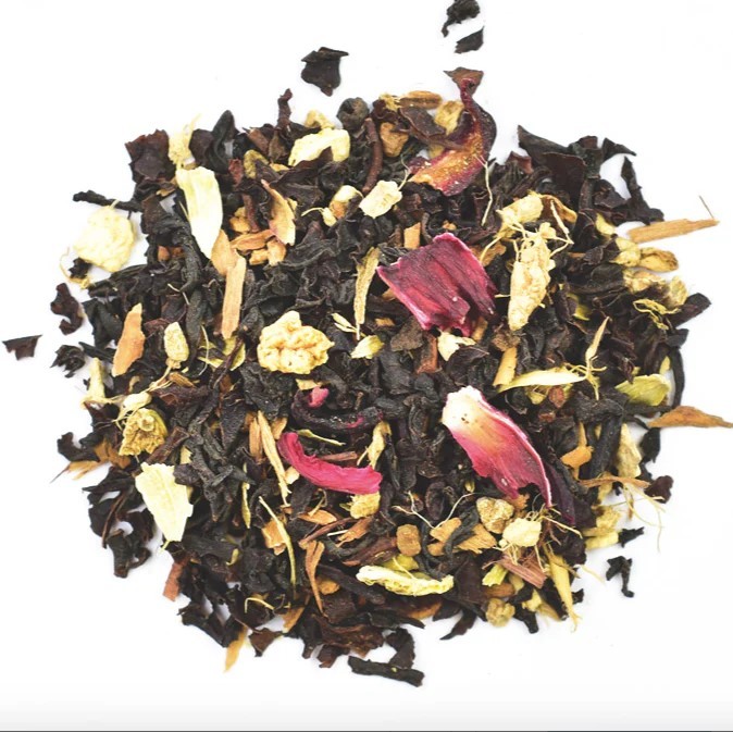Thé noir d'Inde* (49%) , épices (cannelle*, gingembre*, cardamome*, baies roses*) (41%), écorces d'orange*, hibiscus*, huiles essentielles de (mandarine*, orange*, bergamote*), extrait de vanille*, pétales de bleuet*.