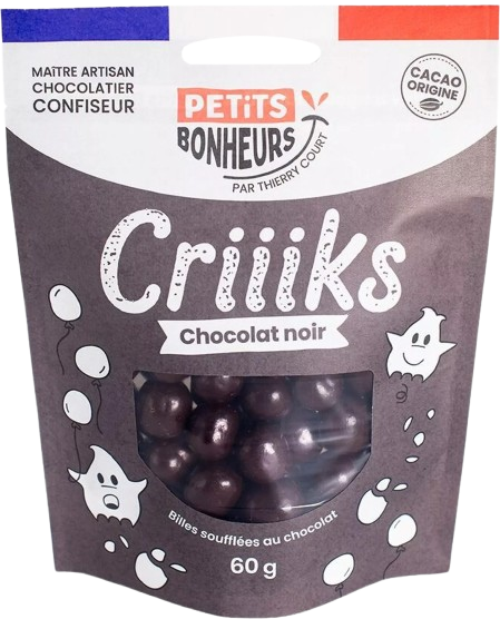 Légères et croustillantes avec leurs billes de céréales soufflées, les Criiiks font "cri-cri-sss" en bouche. Enrobées de chocolat lait éco-responsable. Ces billes sont une nouvelle alternative à un snacking plus raisonné et plus gourmand !