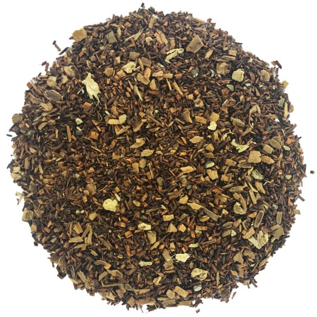 Rooibos* Afrique du Sud (70%), cannelle* (15%), cardamome* (3,75%), gingembre* (3,75%), clou de girofle* (3,75%), poivre noir* (3,75%)